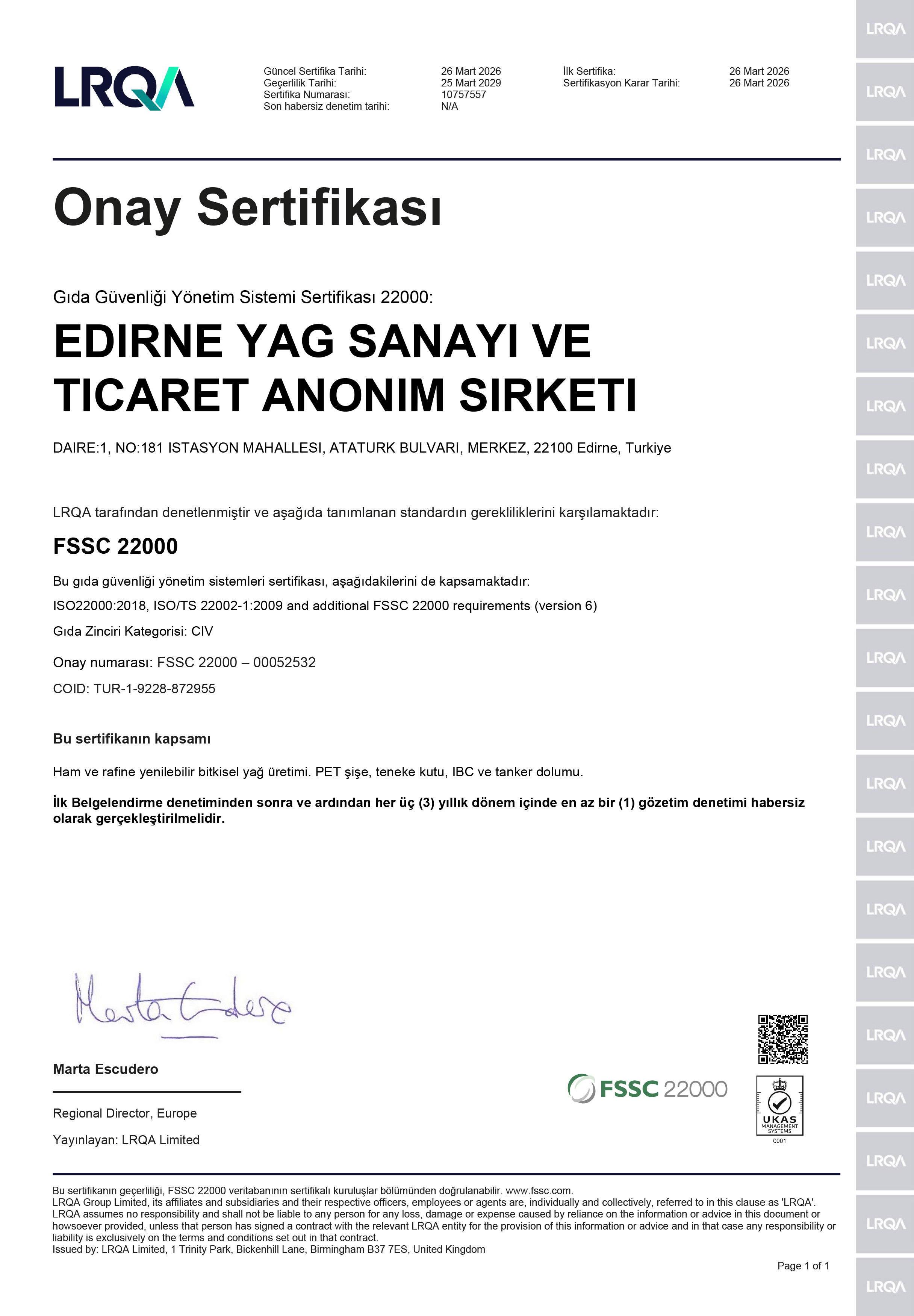 Edirne Yağ Sanayi ve Tic. A.Ş., 2003 yılından bu yana ISO 9001 Kalite Yönetim Sistemi ile sürdürdüğü kurumsal disiplinini, Mart 2026 itibarıyla FSSC 22000 sertifikasıyla küresel standartlara taşımıştır. Bitkisel ham yağ ve yemeklik sıvı yağ üretim, satış ve pazarlama süreçlerinin tamamında uluslararası gıda güvenliği protokollerini titizlikle uygulayan kurumumuz, tarladan nihai tüketiciye kadar güvenilir ürünler sunduğunu bir kez daha kanıtlamıştır.